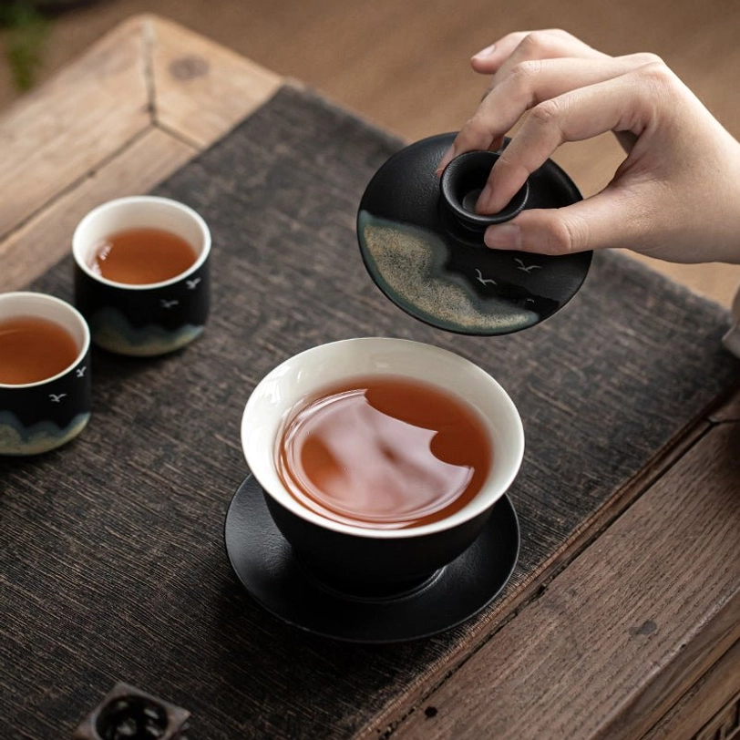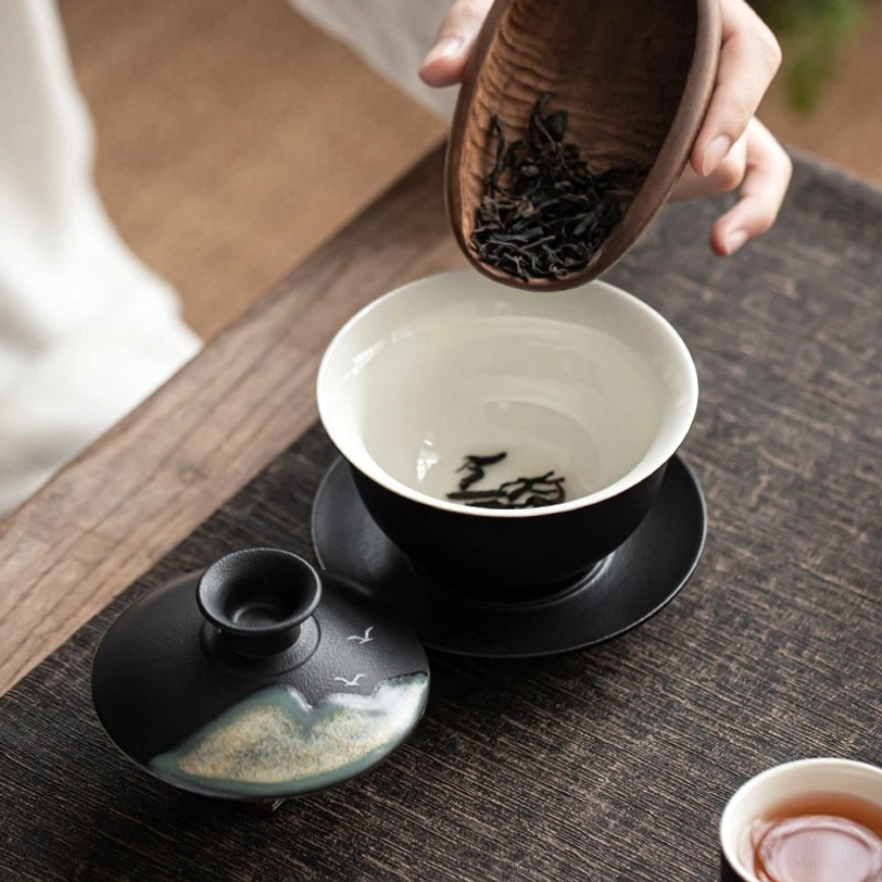 This 3-piece gaiwan tea cup is a classic staple of Chinese tea culture, designed to make brewing loose leaf tea intuitive, elegant, and full of ritual. Crafted from high-fired ceramic with a muted black finish and traditional landscape artwork, this gaiwan balances functional utility with understated cultural charm for every tea lover.