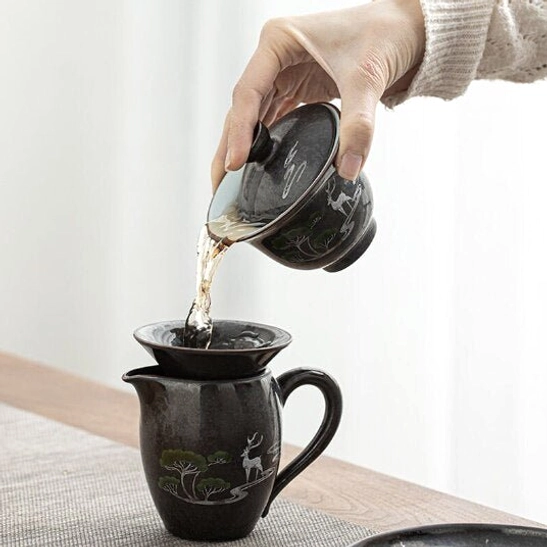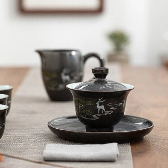 This complete 4-piece gaiwan tea cup set blends traditional Chinese tea craftsmanship with contemporary minimalist design. Featuring understated natural deer and woodland motifs on a matte deep black base, this set brings timeless cultural elegance to any tea ritual, whether you’re a new tea enthusiast or a seasoned collector.