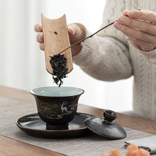 The deer motif on this gaiwan tea cup carries auspicious meaning in Chinese culture: deer symbolize good fortune, longevity, and peaceful prosperity, making this set a thoughtful meaningful gift for any tea lover.