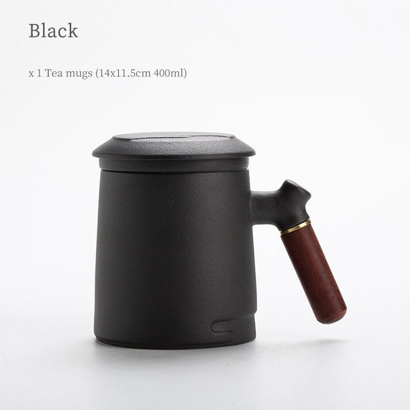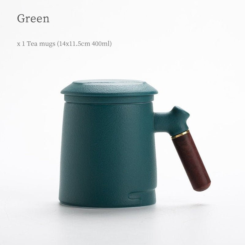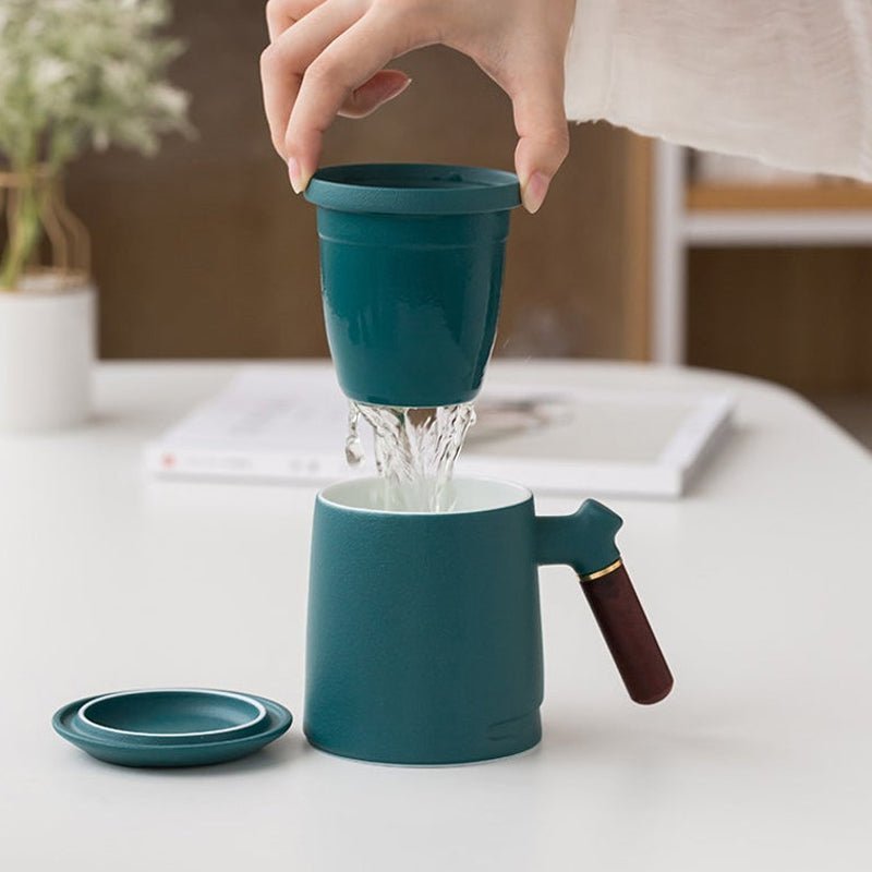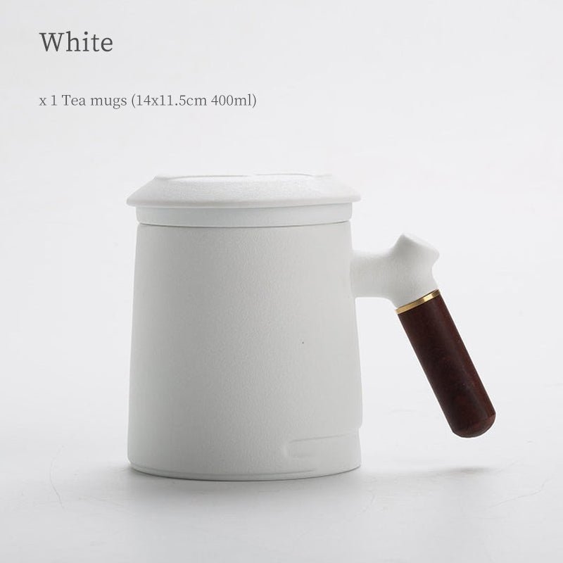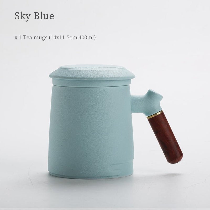 Handcrafted 400ml large ceramic tea mug with built-in stainless steel infuser for effortless loose leaf steeping. Heat-insulated wood handle, multiple colors available for office & home use.
