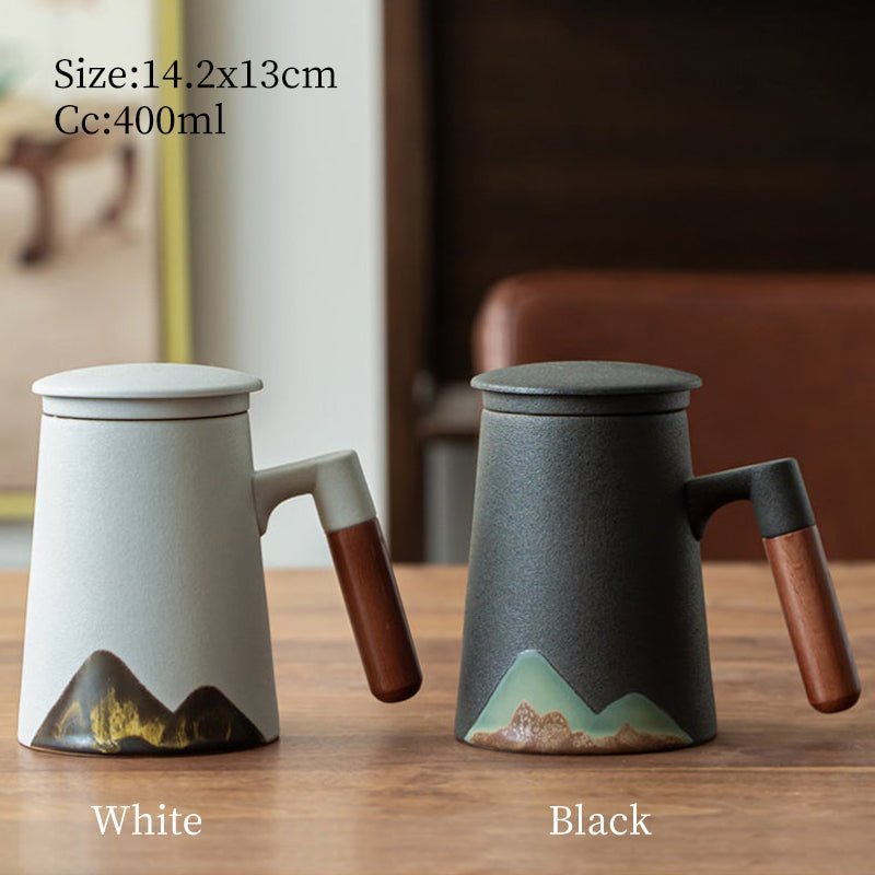 Handcrafted ceramic tea mug with built-in infuser, natural wooden handle and mountain motif design. Perfect for loose leaf tea at home or office. Available in black & white.