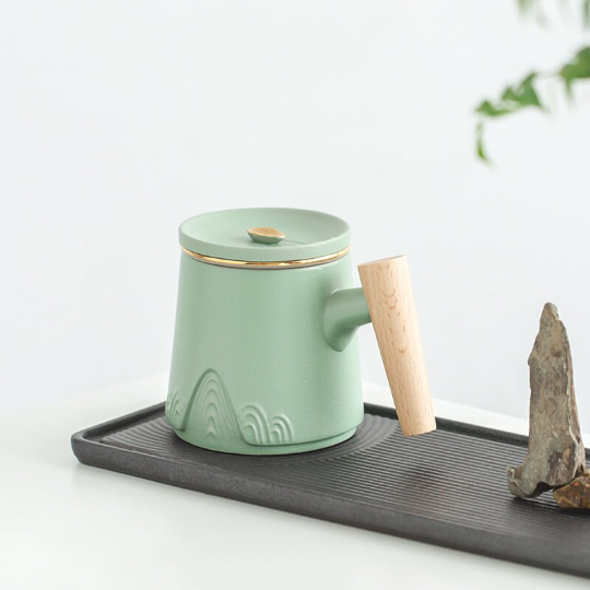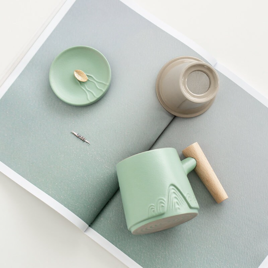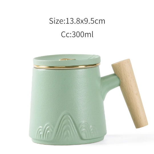 300ml Ceramic Tea Mug with Infuser, Wood Handle, Relief Mountain Pattern