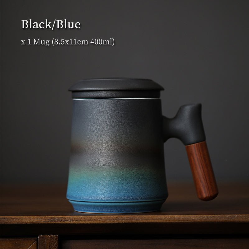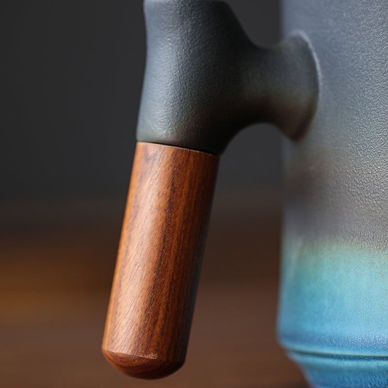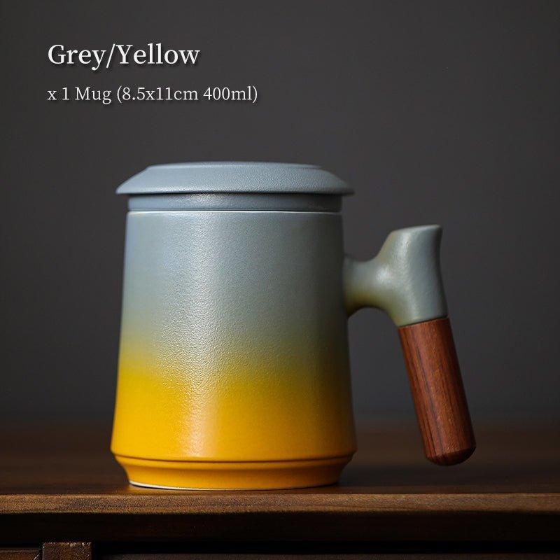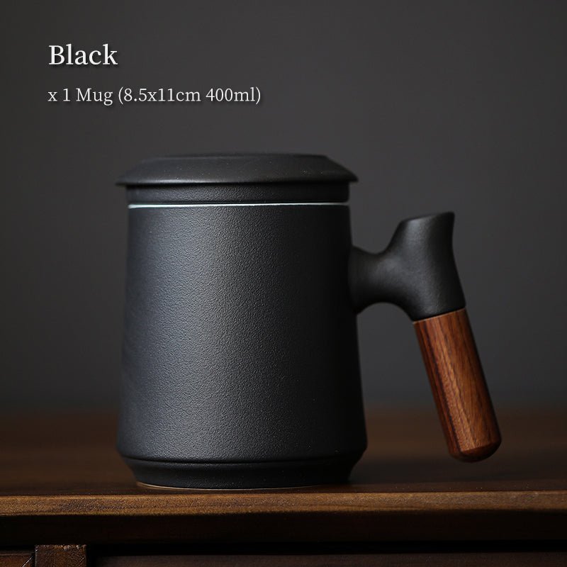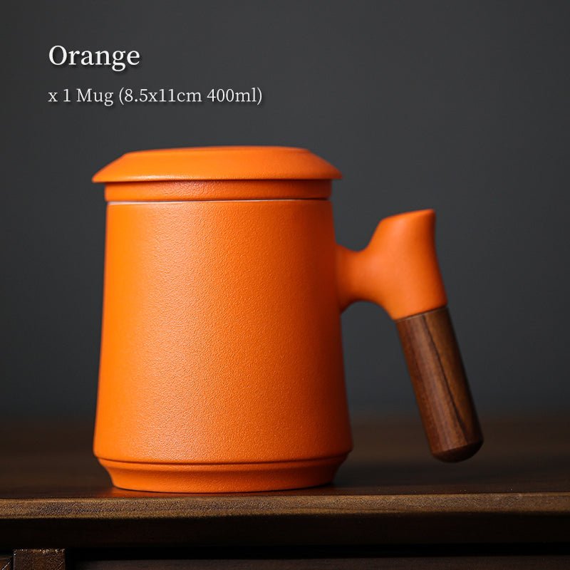 Handcrafted modern Chinese ceramic tea mug with built-in strainer, heat-resistant wood handle, and 400ml (13.5oz) capacity. Perfect for office steeping and daily tea drinking.