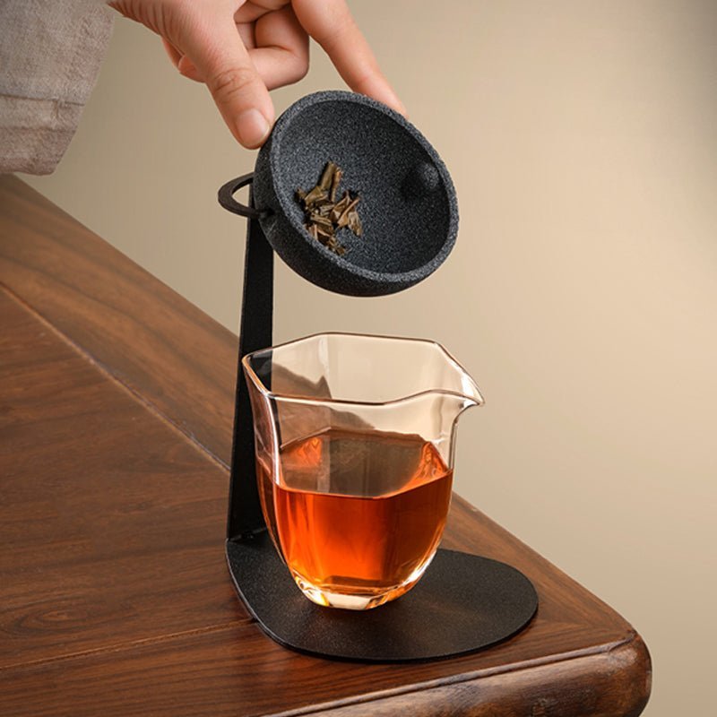 - Premium Quality Materials: The strainer body is crafted from textured matte black ceramic with a natural stone-like finish, offering excellent heat resistance, low odor absorption, and long-lasting durability. The sturdy black metal stand holds the strainer securely over any standard gongdao bei (fair cup) or teacup for mess-free brewing.