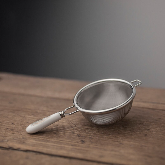 Premium 304 stainless steel fine mesh tea strainer with heat-resistant ceramic handle. Filters loose leaf tea seamlessly, fits most teapots and gongdao bei. Perfect for home, office and traditional Chinese tea ceremonies.