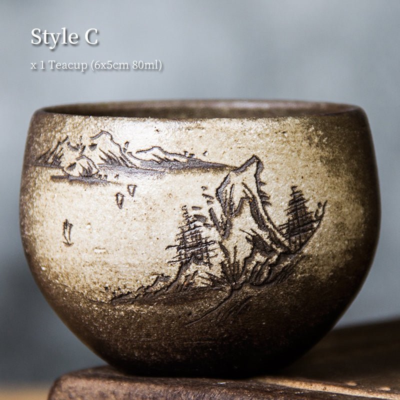 Handcrafted Chinese rustic ceramic tea bowl, hand-painted with traditional Chinese landscape and flower motifs. Perfect for daily tea tasting, gifting and collection, 80ml (2.7oz) capacity.