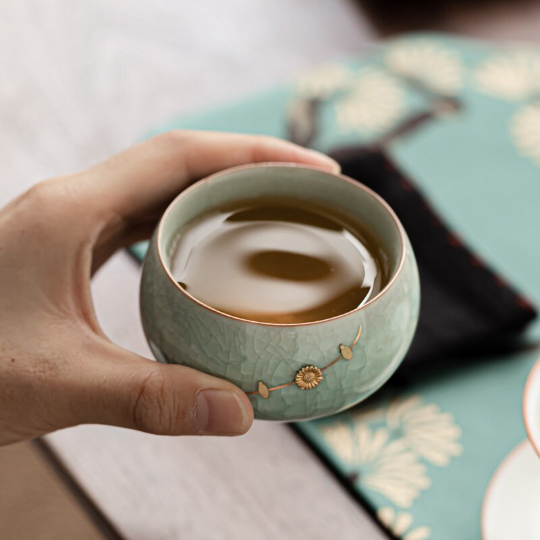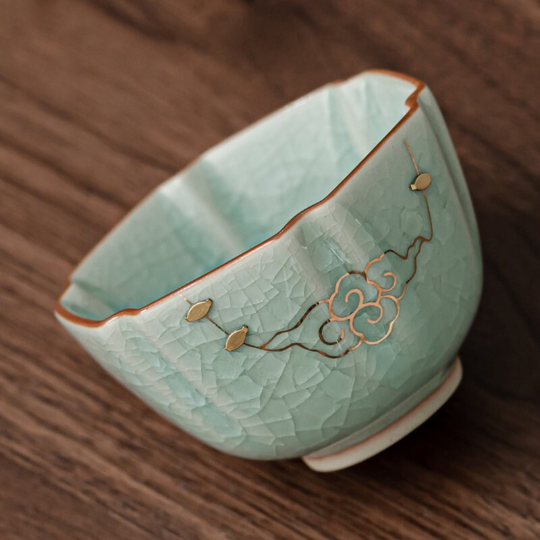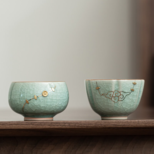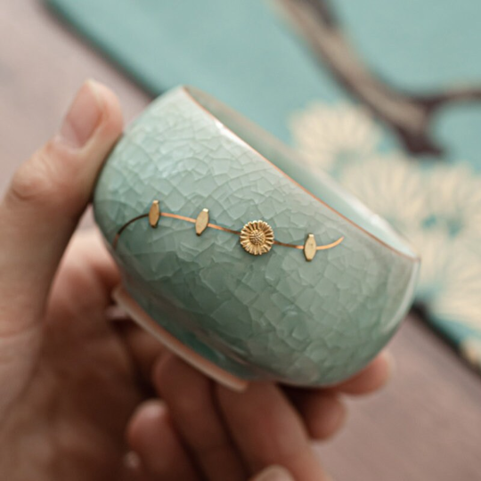 Ice crackle glaze first gained popularity during the Song Dynasty (960–1279 CE) as a signature feature of the iconic Ge Kiln ceramics. Each piece features a completely unique natural crackle pattern formed during the firing process—no two cups are ever identical. Our decorative kintsugi (gold repair inspired detailing) adds a subtle, luxurious contrast to the soft sage ceramic base, embodying the Japanese and Chinese wabi-sabi philosophy of finding beauty in imperfection.