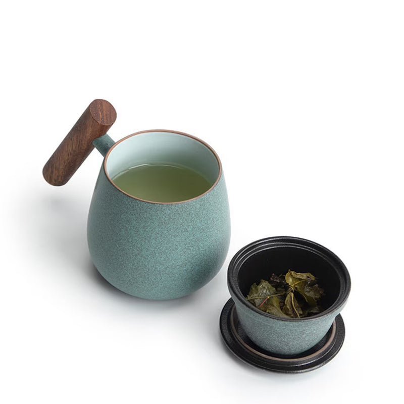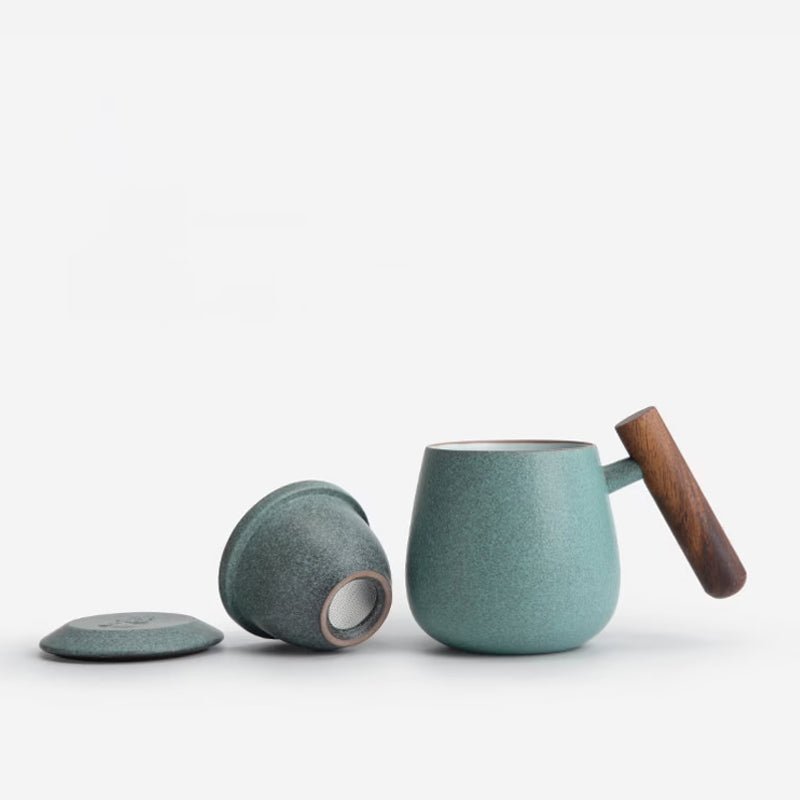 Premium ceramic tea infuser mug with removable filter & wood handle. Perfect for office & home loose leaf tea brewing, available in black and green.