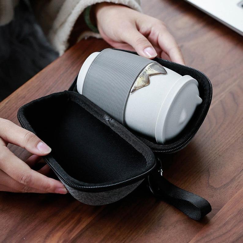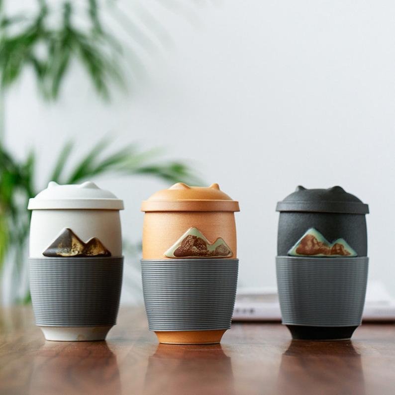 Handcrafted ceramic travel tea mug with built-in infuser for loose leaf tea, featuring artistic mountain design, heat-resistant silicone grip, and included travel pouch. Perfect for office, travel, and tea lovers.