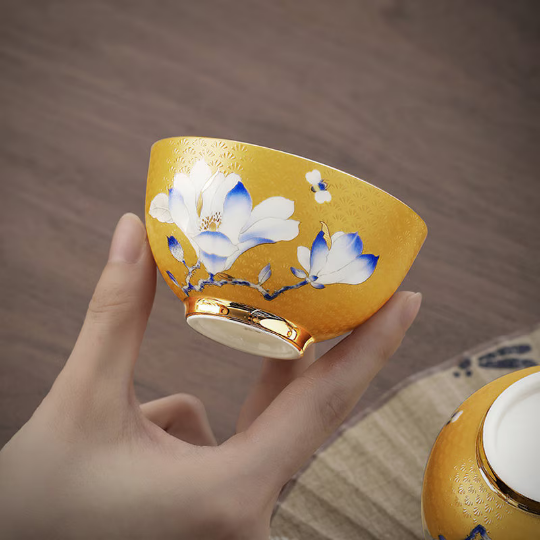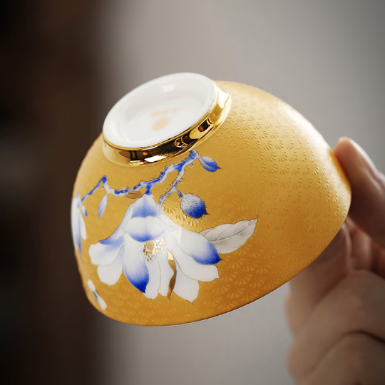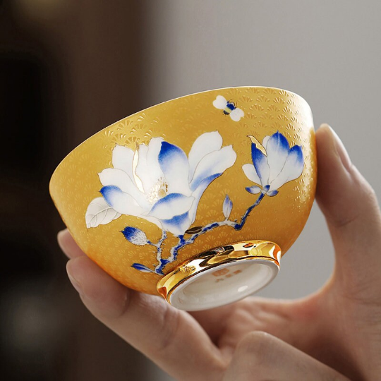 In traditional Chinese culture, magnolia flowers symbolize purity, nobility, good fortune, and lasting beauty. The warm golden yellow base of this cup paired with delicate blue and white magnolia blooms creates a harmonious balance that reflects the core principles of Chinese tea philosophy: tranquility, balance, and appreciation for simple beauty. Each hand-painted magnolia is unique, making your tea cup a one-of-a-kind work of art that carries centuries of ceramic craft heritage.
