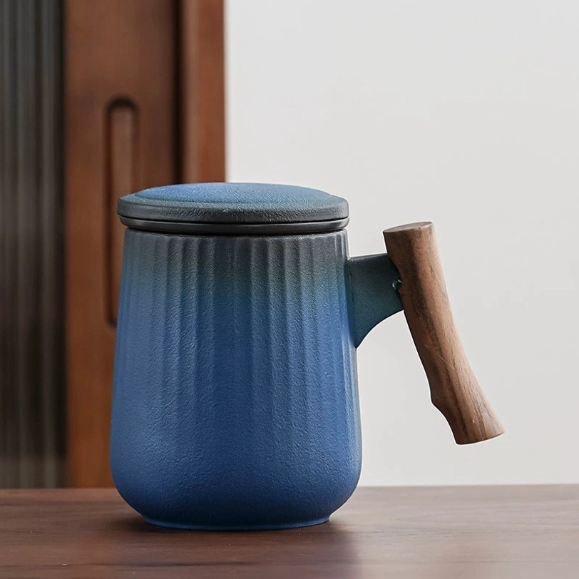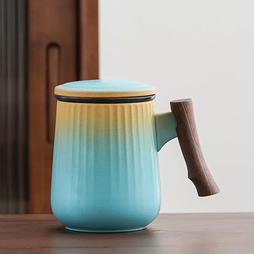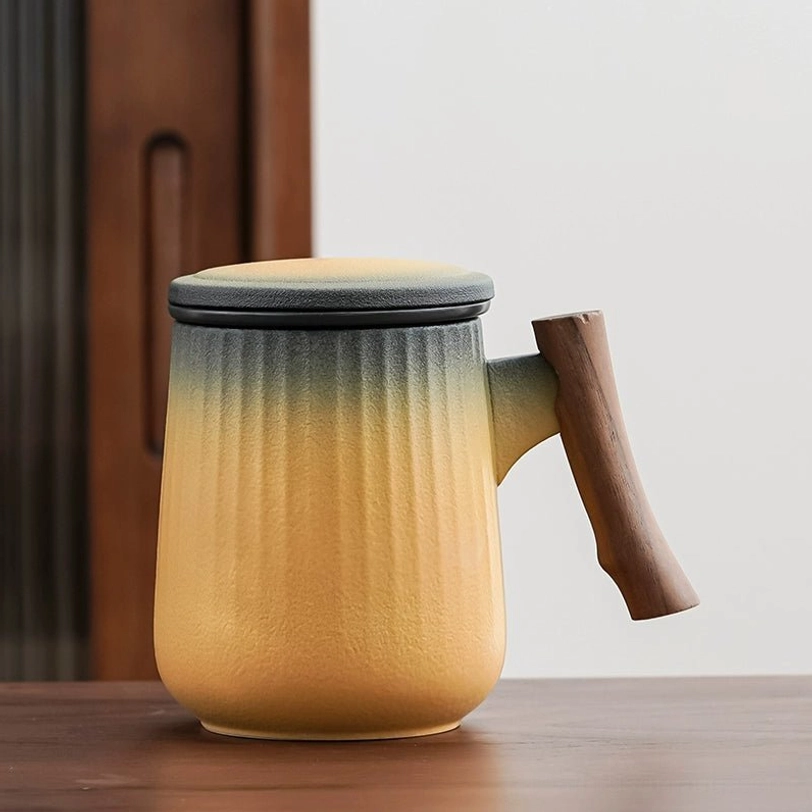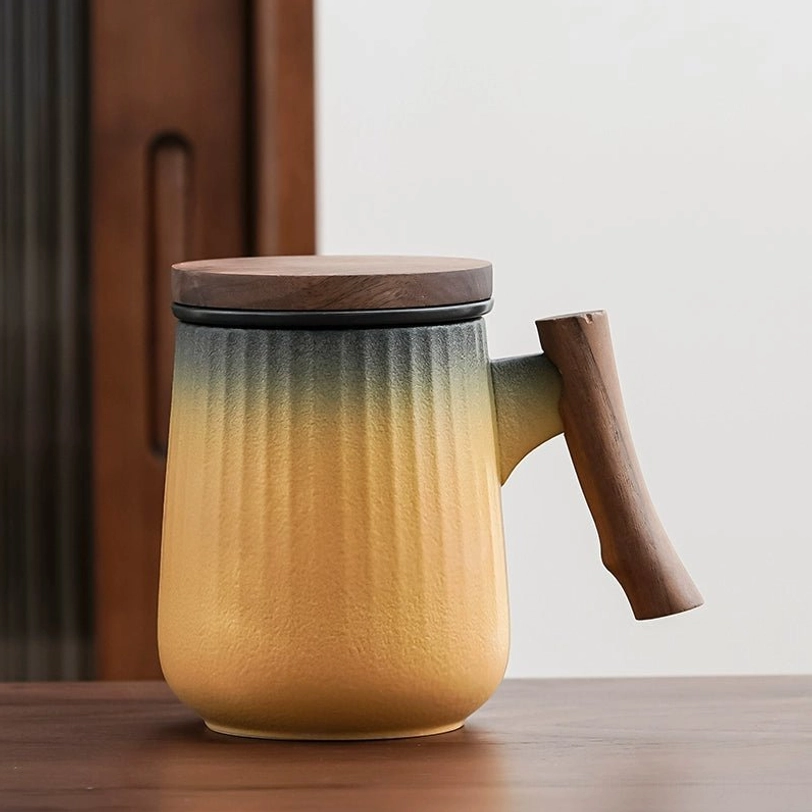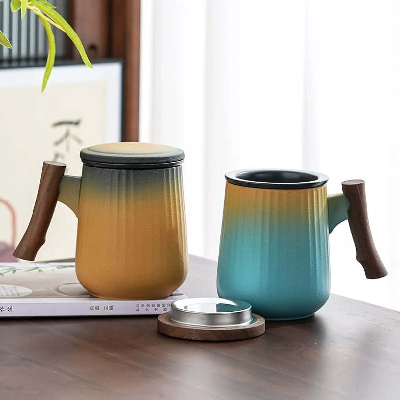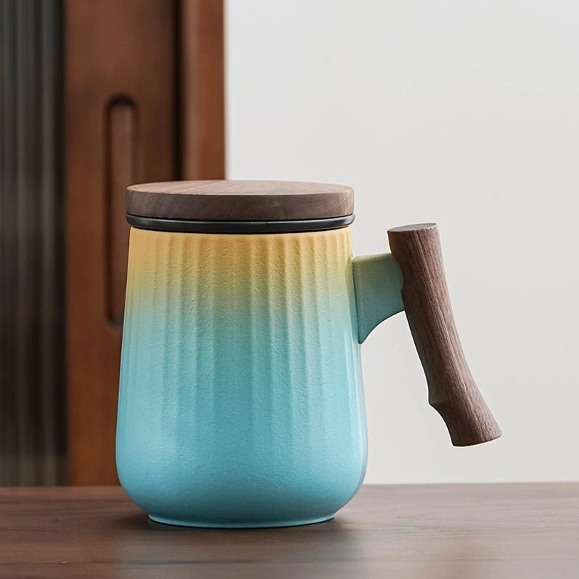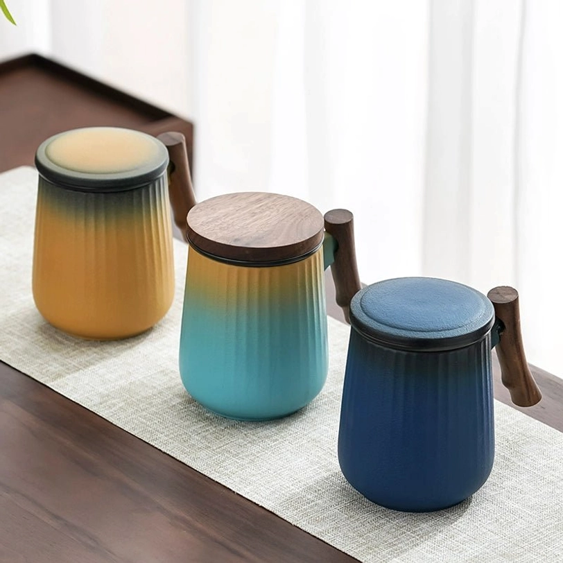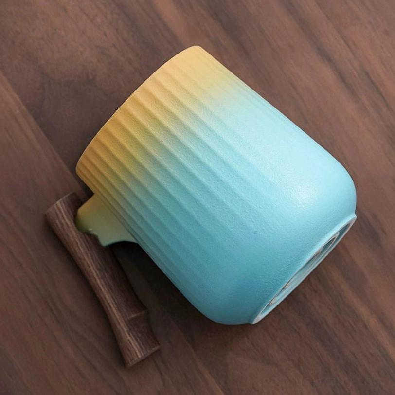 Each mug features a soft gradient color finish with subtle vertical stripes that add visual depth and improve your grip. The balanced combination of smooth ceramic and warm natural wood creates a clean modern aesthetic that fits any decor, from minimalist office spaces to cozy modern homes. It works double duty as a functional brewing tool and a beautiful desktop accent.