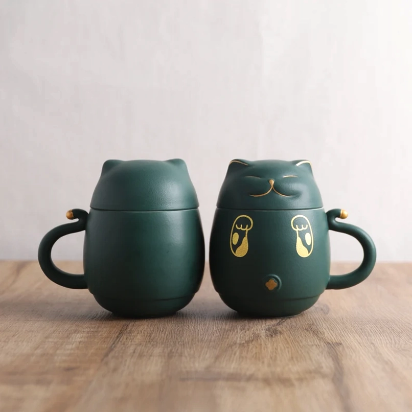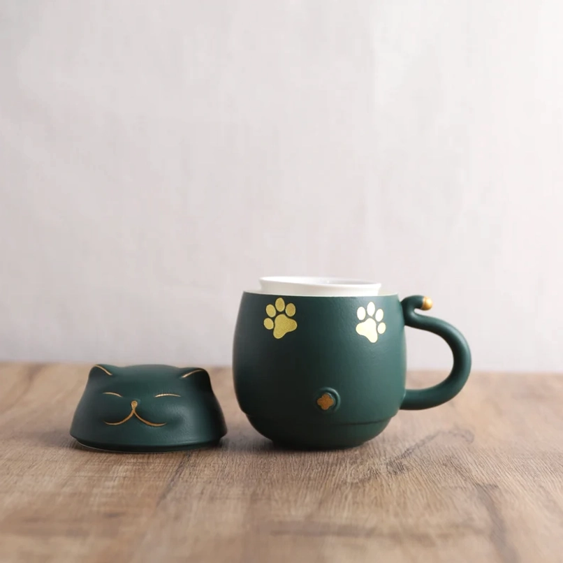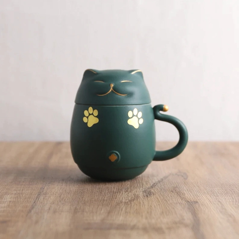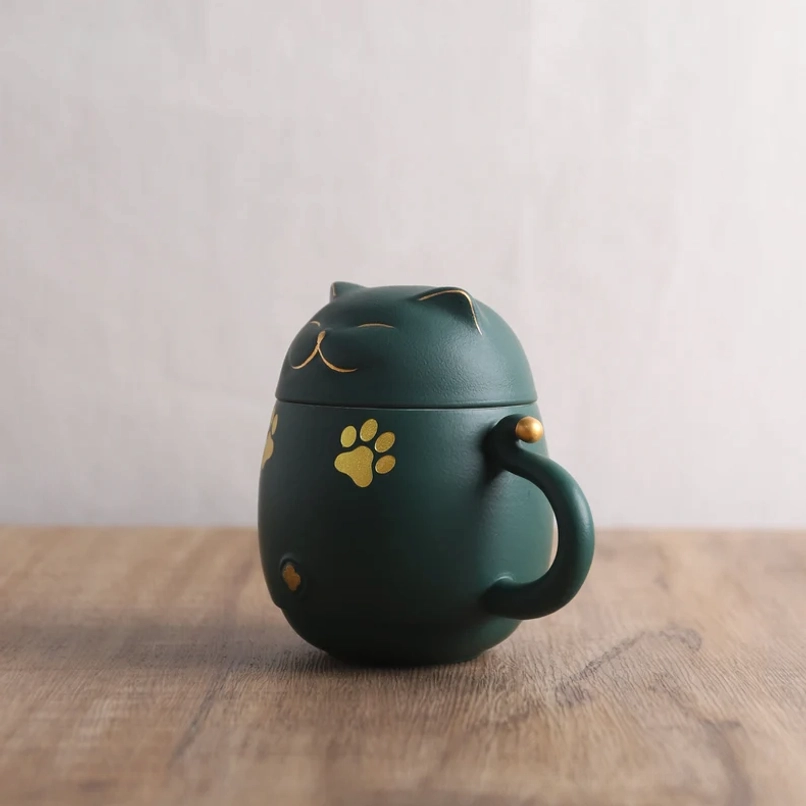 This lucky cat tea infuser mug is crafted from high-quality food-safe ceramic, designed for lasting daily use: The deep forest green matte outer body delivers a soft, smooth hand feel, while the removable white ceramic infuser is non-porous, hygienic, and simple to clean. Every detail is expertly finished, with delicate gold accents that add subtle luxury to the playful cat-themed design.