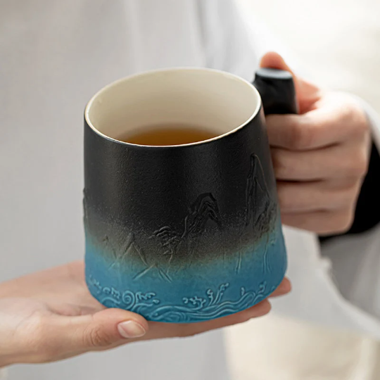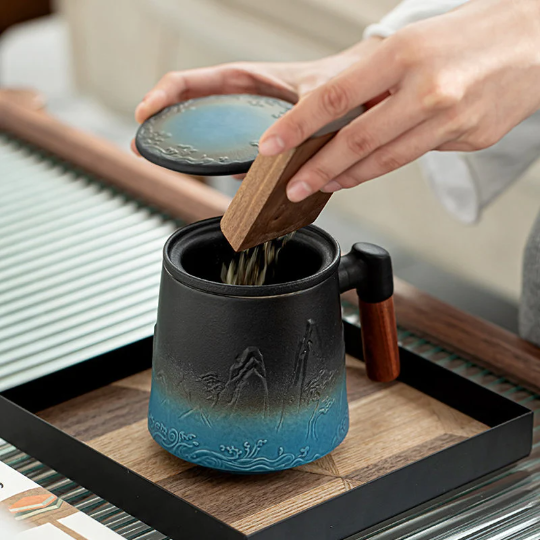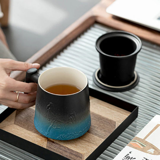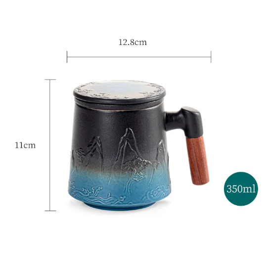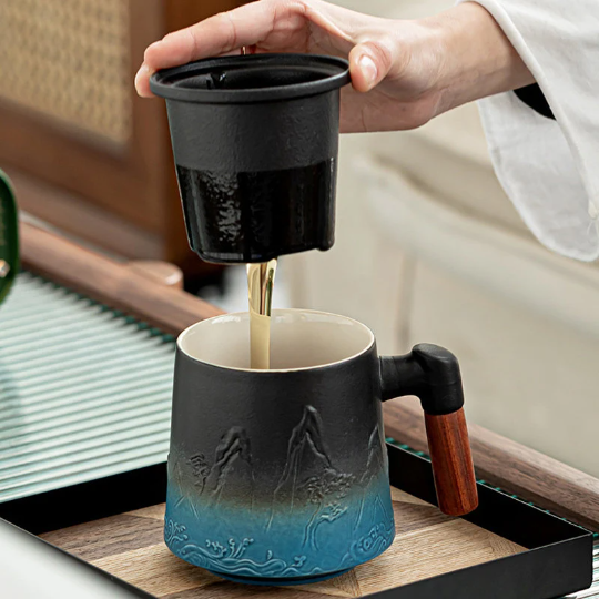 This all-in-one personal tea cup is designed for loose leaf tea lovers, combining traditional Chinese ceramic craft with modern practical design. Inspired by classic Chinese ink wash landscape art, this cup brings elegant cultural charm to your daily tea routine.