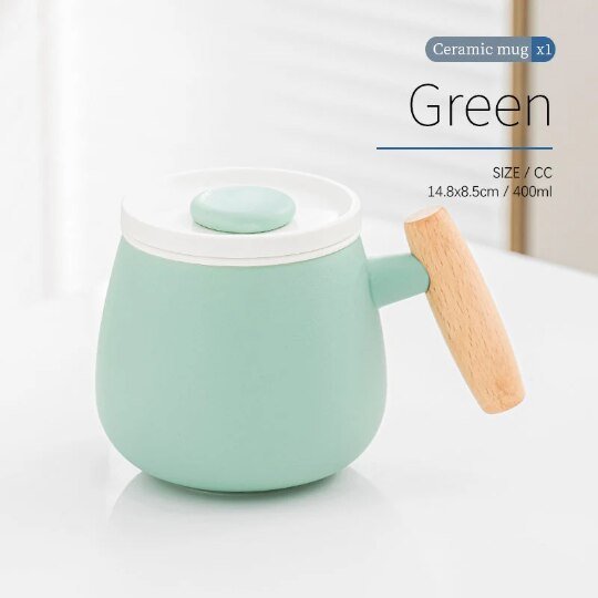 Handcrafted 400ml large ceramic tea mug with removable infuser for loose leaf tea. Wooden heat-proof handle, 3 stylish colors available for office & home use.