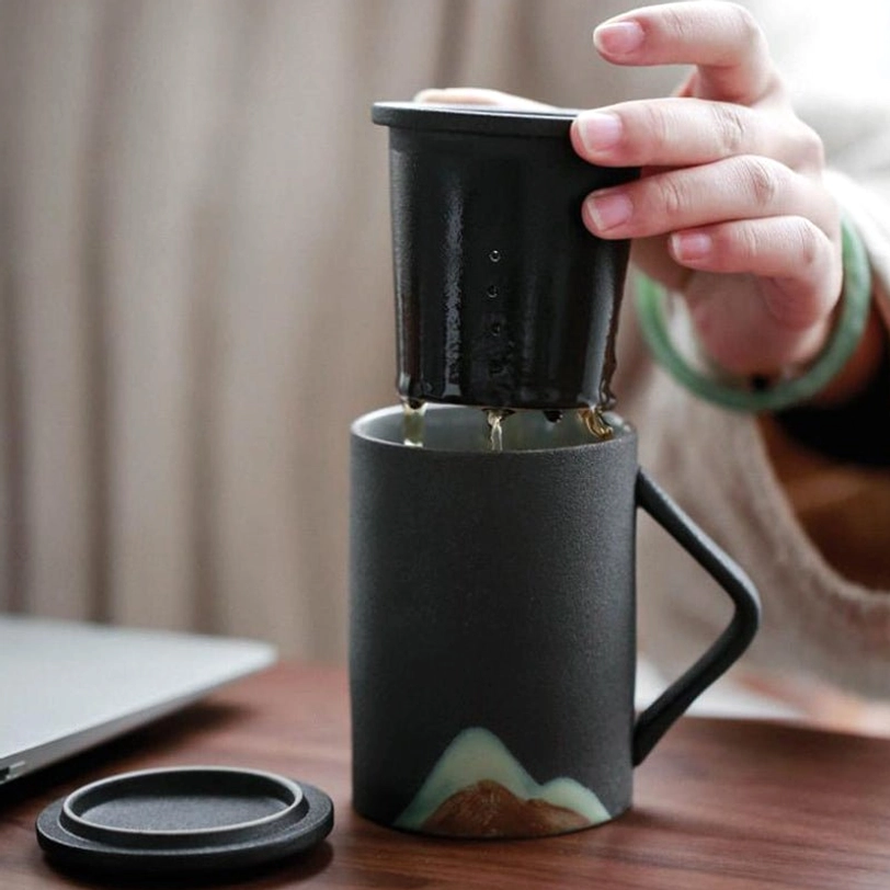 Blending traditional Chinese ceramic craft with modern everyday convenience, this all-in-one tea infuser mug is designed for effortless loose leaf tea enjoyment, no extra equipment required. Inspired by classic Chinese shan shui (mountain and water) painting, the minimalist mountain motif on this mug brings the quiet tranquility of nature to your daily tea ritual, rooted in centuries of Chinese tea ceremony wisdom.