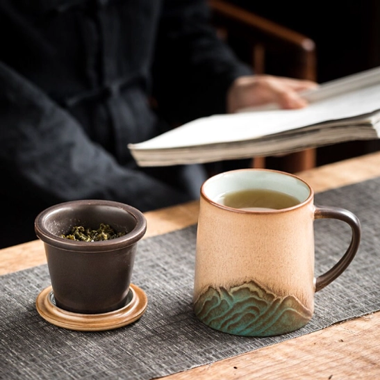 The subtle embossed sage green mountain pattern on a warm tan base brings understated natural elegance to any space. More than just a tea infuser mug, it doubles as a beautiful decorative piece for your office desk, kitchen shelf, or home tea corner, blending new Chinese and wabi-sabi Zen aesthetics to create a calm, inviting atmosphere.