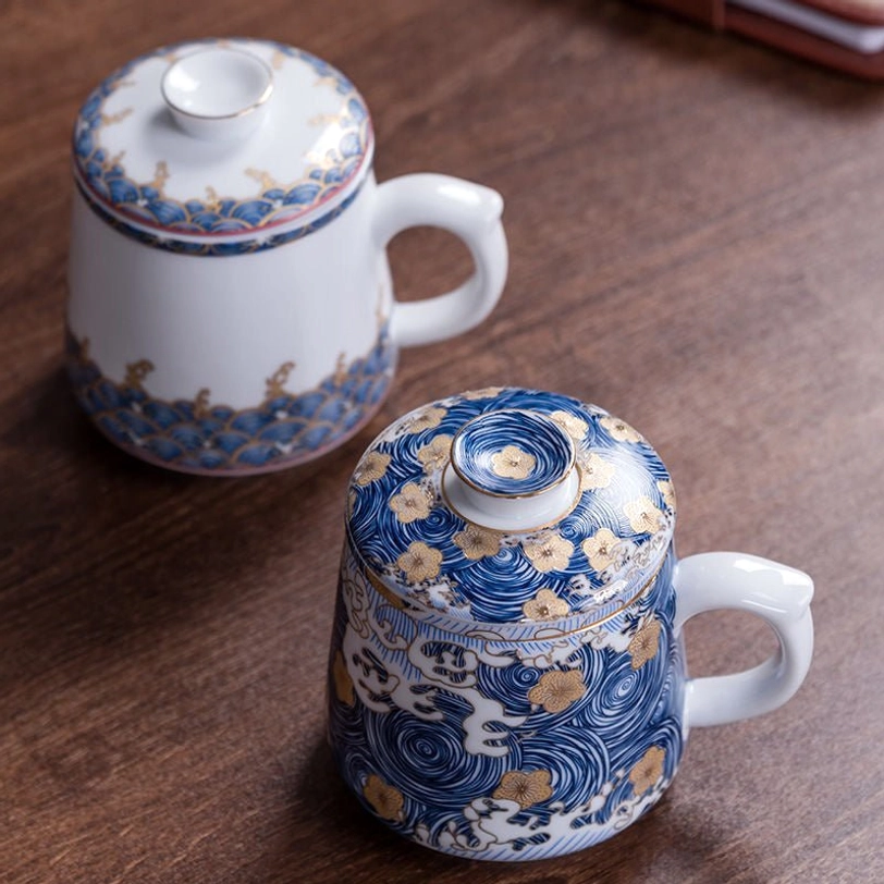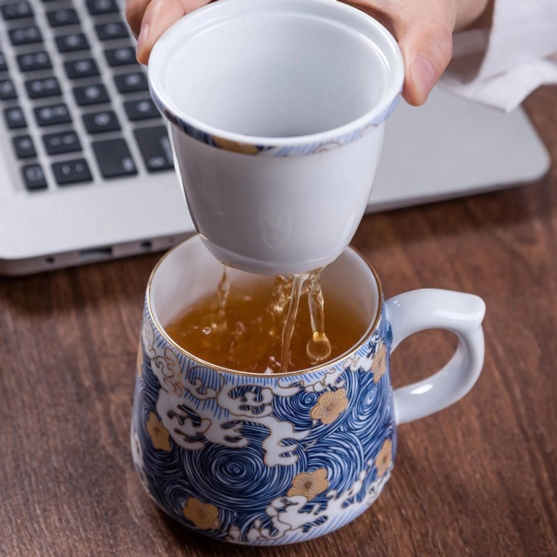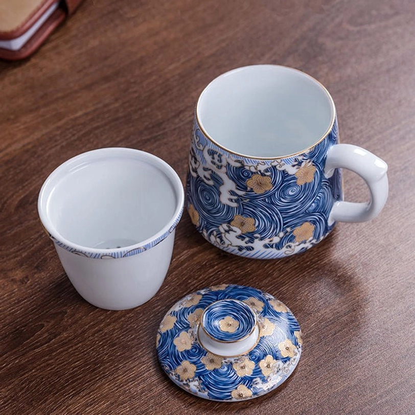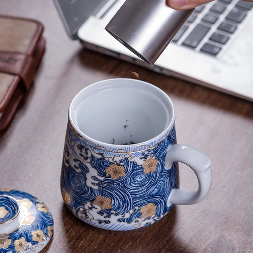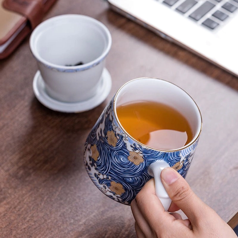 In Chinese culture, the wave motifs on this tea infuser mug symbolize prosperity, abundance, and smooth sailing through all of life’s journeys. Floral designs represent growth, natural beauty, and good fortune, while the blue and gold color palette has been associated with elegance and refined taste in Chinese art for centuries. This mug isn’t just a tea vessel—it’s a piece of cultural tradition that carries heartfelt meaning.