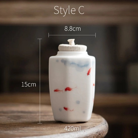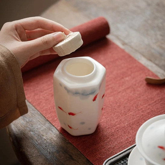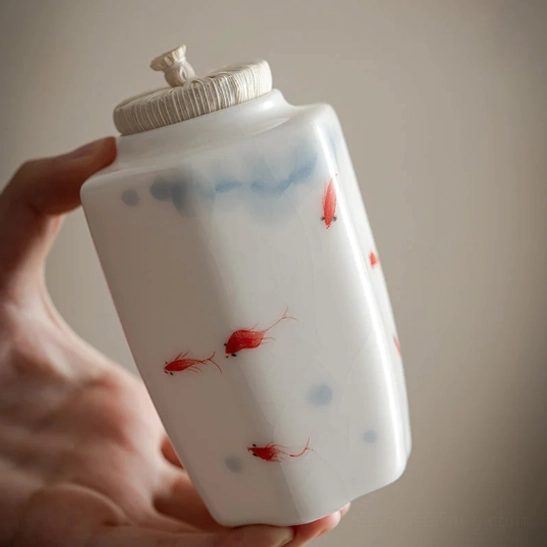 The delicate red fish motif on the canister carries deep auspicious meaning in Chinese culture: “yu” (fish) symbolizes abundance, good fortune, and prosperity. Paired with soft blue ink-wash patterns inspired by traditional Chinese painting, this canister brings a touch of serene, elegant oriental charm to any space.