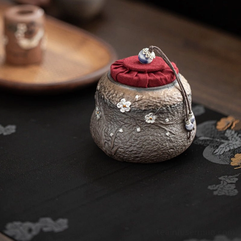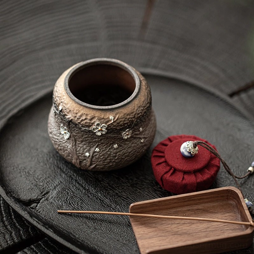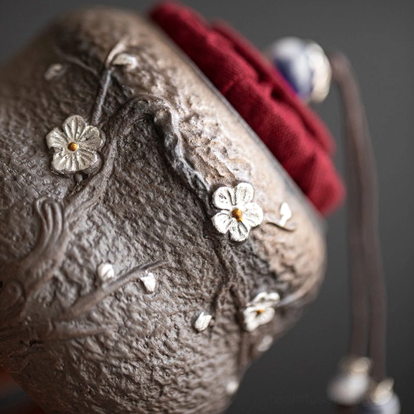 - Color: Dark brown ceramic body, red fabric lid, silver plum blossom decoration