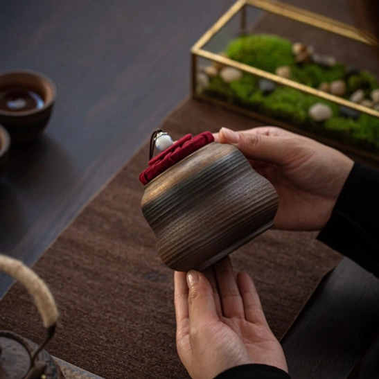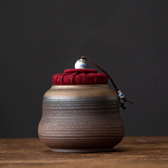 - Distinctive Traditional Chinese Design: The dark glazed body features subtle ribbed texture that adds visual depth and a comfortable grip, while the bold red fabric lid with decorative ceramic bead creates a striking, elegant contrast. This canister works double duty as both a functional storage container and a beautiful decorative piece for your tea table or home.