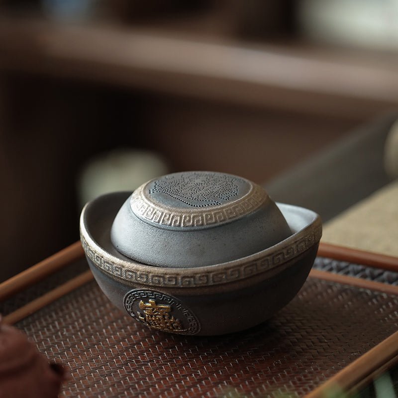 Handcrafted traditional Chinese ceramic tea strainer with auspicious ‘Bring In Wealth’ gold ingot design, filters loose leaf tea perfectly for an elevated, culturally rich tea experience.