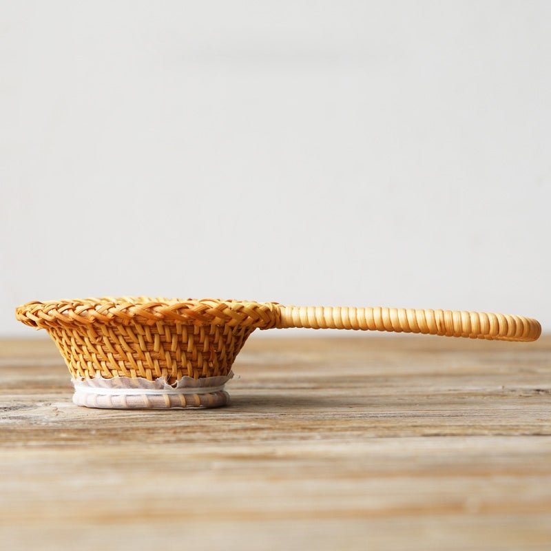 Handcrafted vintage natural bamboo rattan tea strainer with fine mesh, filters loose tea leaves for smooth clear brew. Perfect for tea lovers & traditional tea setups.
