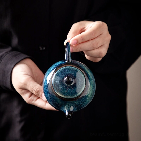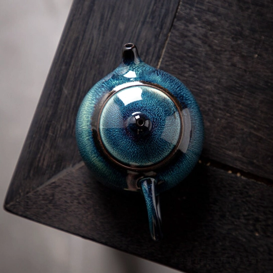 This compact Jianzhan teapot is crafted for personal and small-batch tea enjoyment, featuring a stunning blue-green kiln-fired glaze with natural flowing texture that brings artistry to any tea space. The built-in infuser makes loose leaf brewing simple and clean.