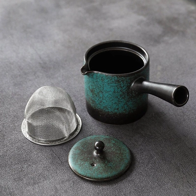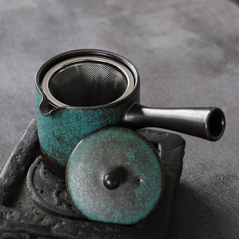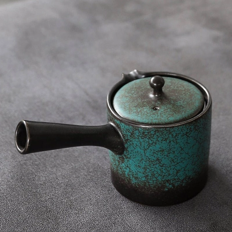 Inspired by traditional Japanese kyusu (side handle) teapot design, this compact ceramic teapot is crafted for smooth, enjoyable loose leaf tea brewing. Its unique mottled blue-green glaze gives every piece a one-of-a-kind rustic vintage look that fits beautifully in modern and traditional tea spaces alike.