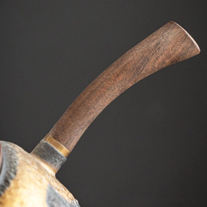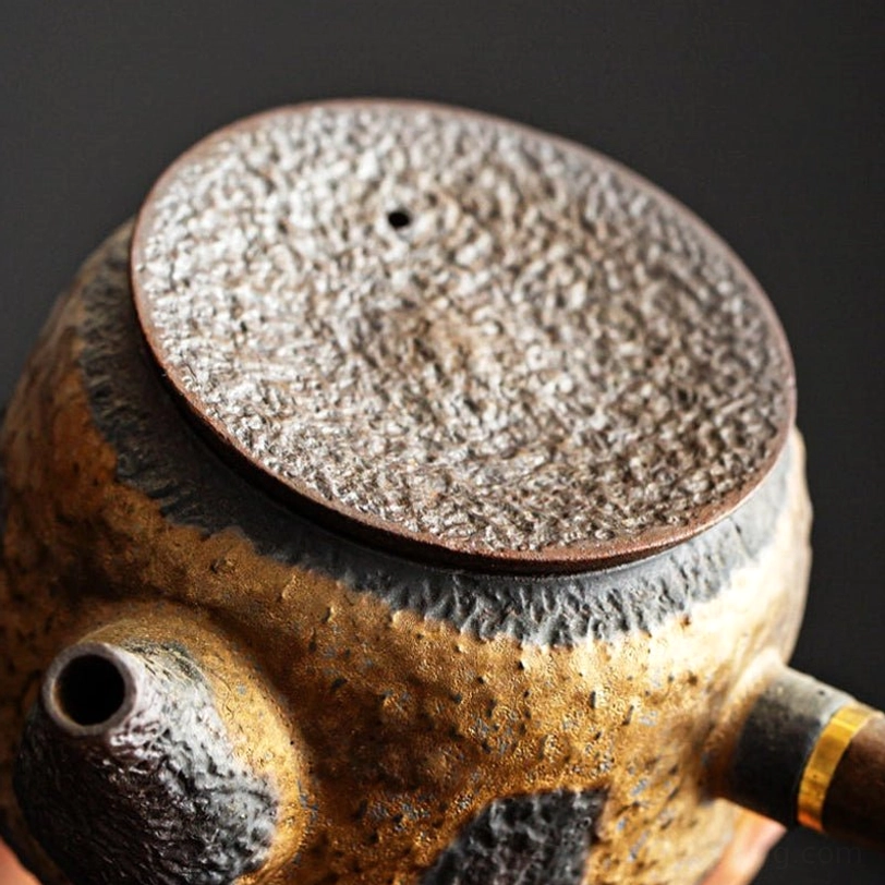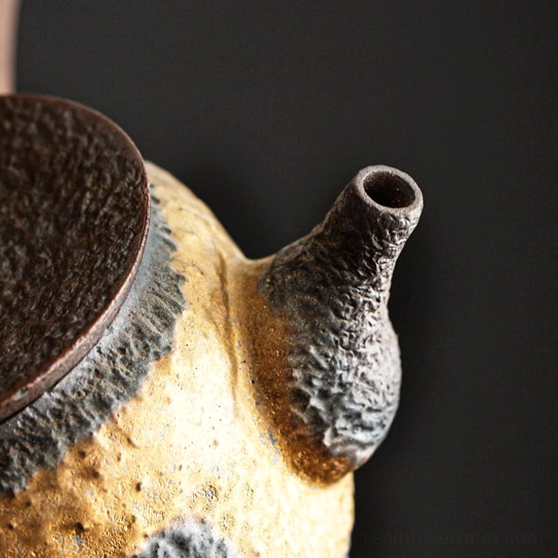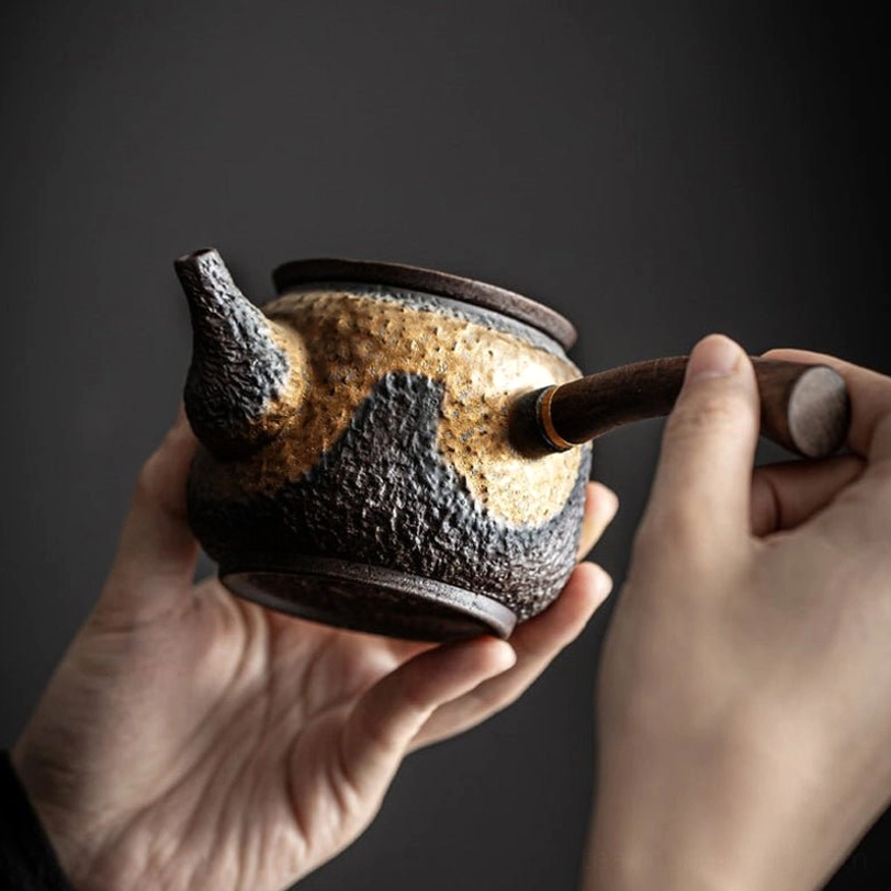 - Premium Materials: Textured porcelain body with natural rock-like grain for a rustic, tactile feel; heat-resistant solid wood side handle with polished gold metal accent, cool to hold even when brewing hot tea, no risk of scalding.