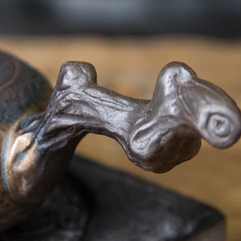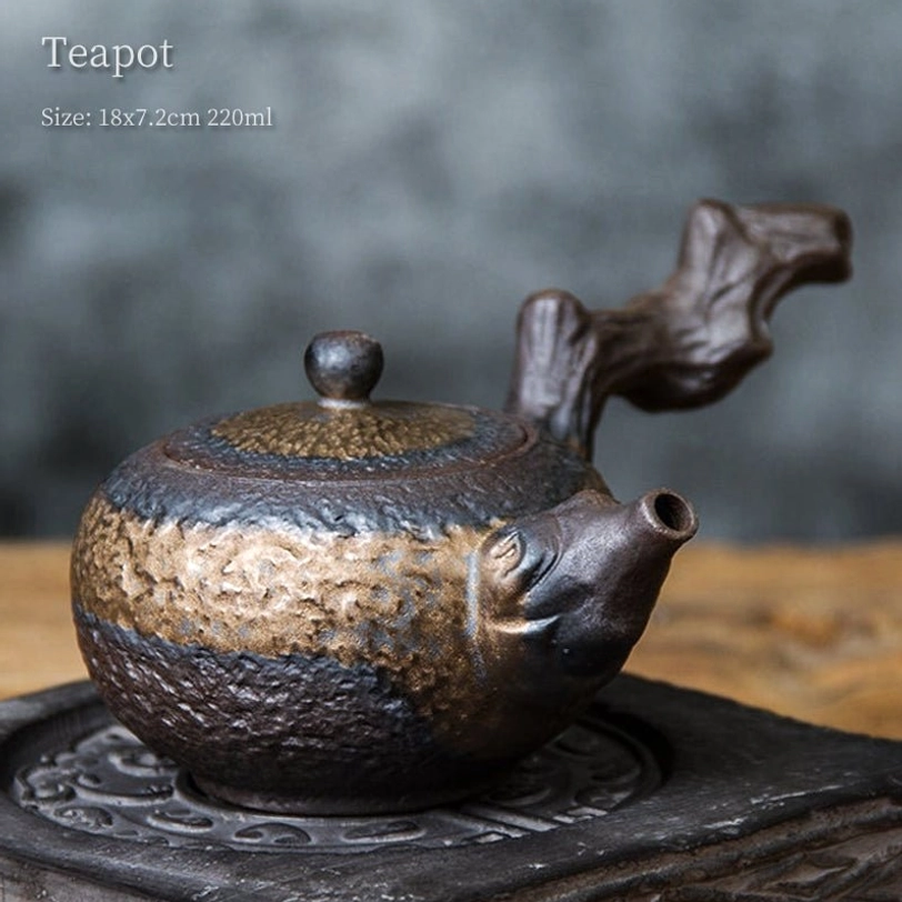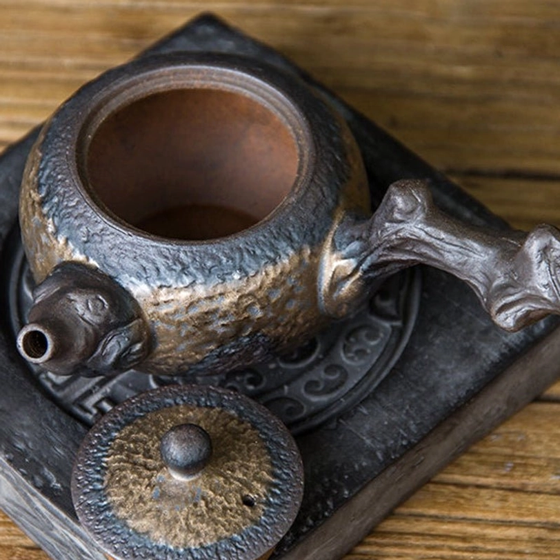 This one-of-a-kind ceramic kyusu draws inspiration from natural woodland forms, with a side handle shaped like a gnarled withered branch and a sculpted spout that evokes organic wildlife. The textured hammered glaze pairs deep warm brown with subtle metallic bronze accents for a rustic, artful look that stands out on any tea table.