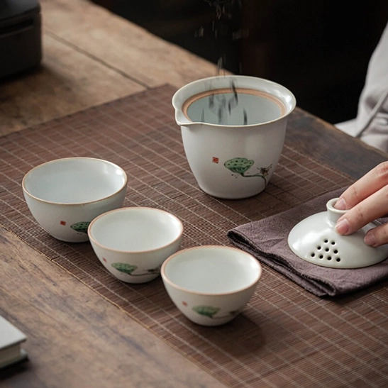 Complete 5-piece lotus-patterned ceramic Travel Tea Set with waterproof carrying bag. Brew authentic Gongfu tea anywhere you go.
