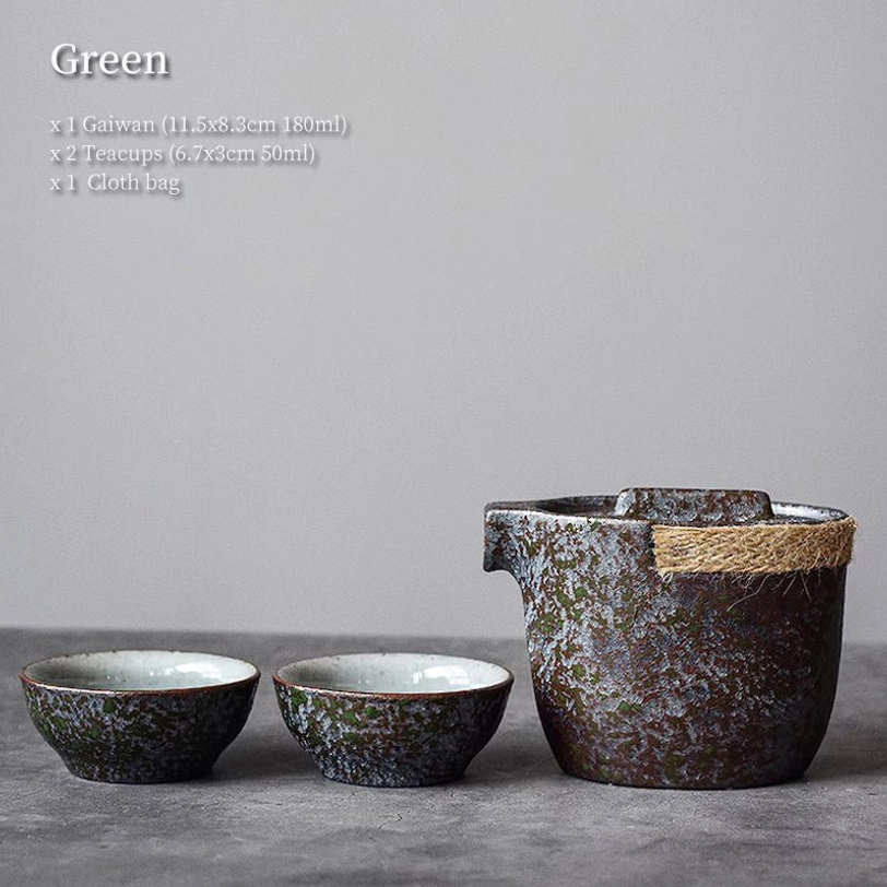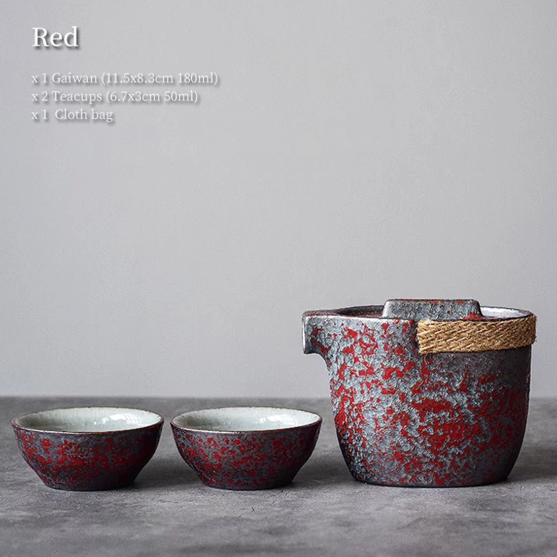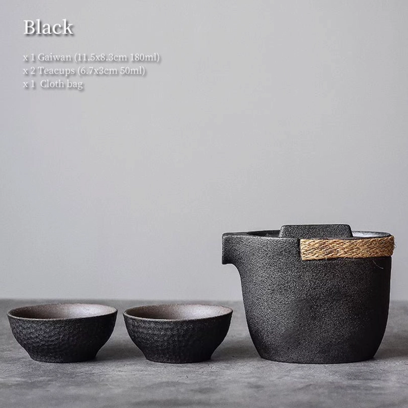 Compact 3-piece Travel Tea Set for on-the-go Gongfu tea. Includes 1 lidded gaiwan, 2 teacups & protective carrying bag, perfect for travel, office and outdoor use.