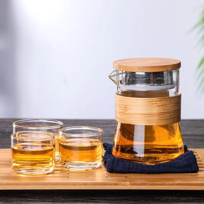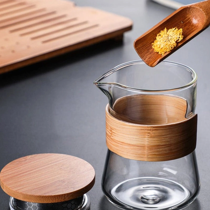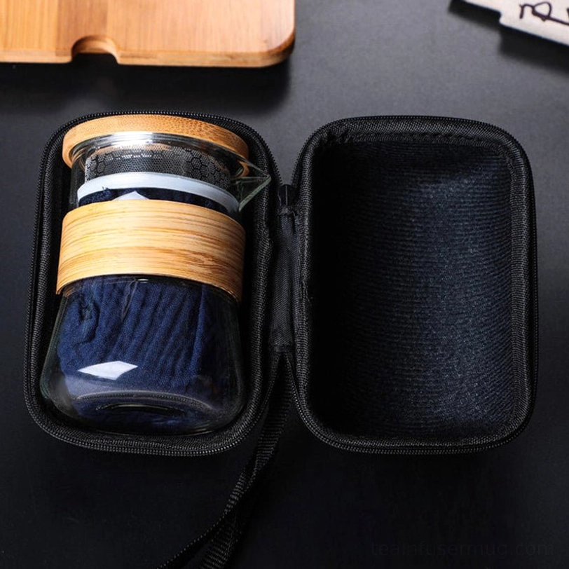 Complete compact travel tea set for on-the-go brewing. Features heat-resistant glass, built-in infuser, and protective carry bag. Perfect for travel, camping and office use.