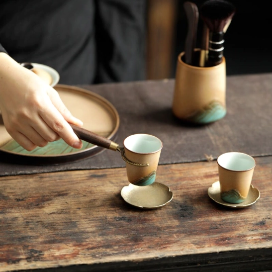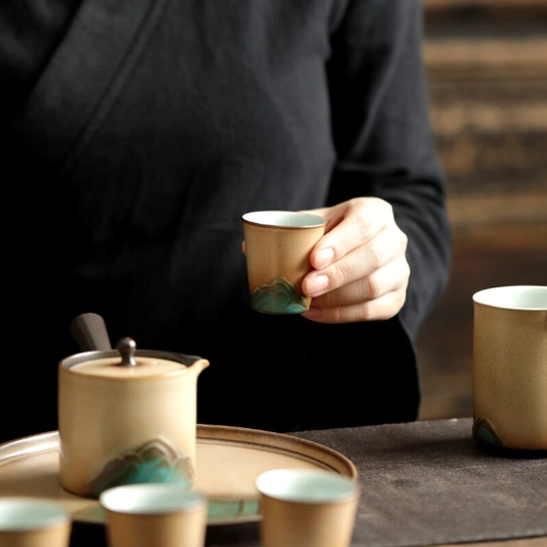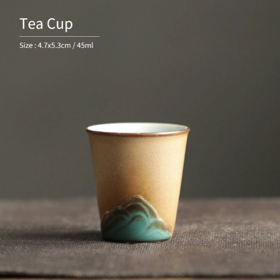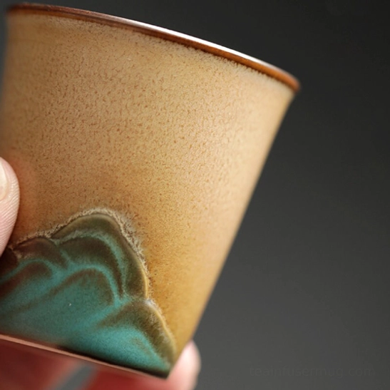 - Artistic Mountain Relief Design: The 3D青绿色 (green-blue) mountain relief at the base of the cup adds a tactile and visual depth that sets this cup apart from ordinary plain tea cups. The warm tan body, rust-red rim trim, and pale celadon interior create a balanced, harmonious color palette that blends traditional Chinese aesthetics with modern minimalist style.