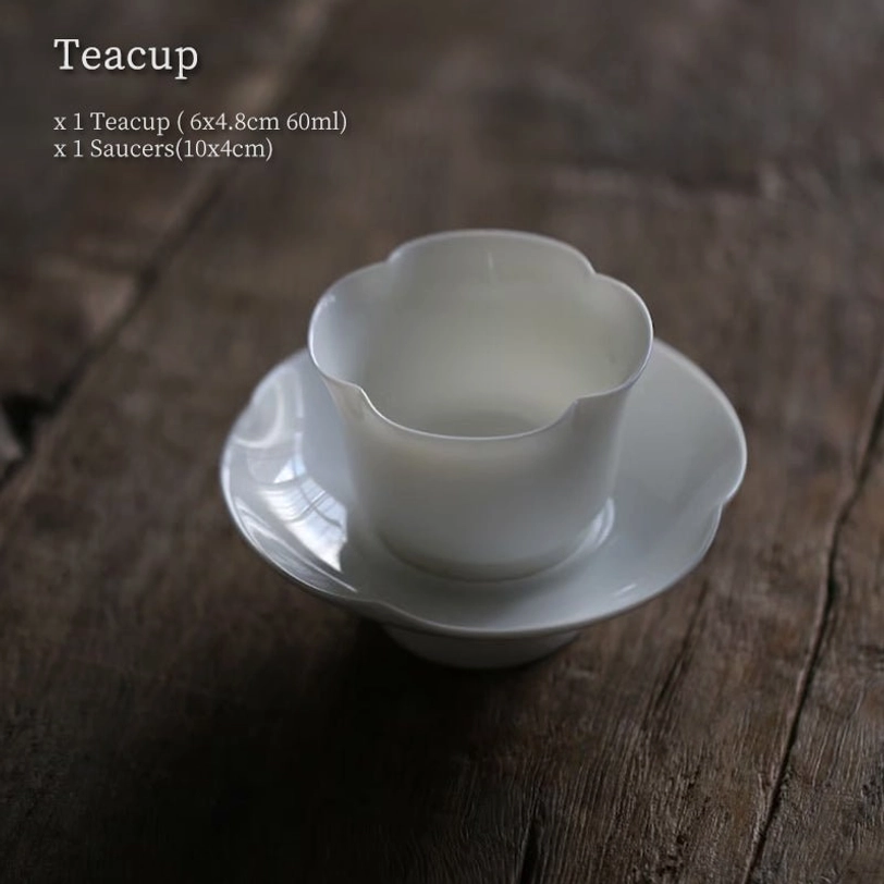 Rooted in centuries of Chinese tea culture, this petite white porcelain tea cup and saucer set is crafted to elevate your daily gongfu cha ritual. With its delicate petal-shaped edge and pure translucent glaze, it brings understated elegance to any tea experience.